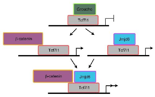 displacement of Groucho from Tcf7l1 and turns Tcf7l1 into an activator. Jmjd6 interacts with Tcf7l1 in
