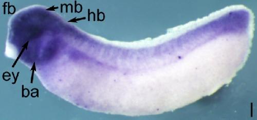 with the dorsal at the top of the panel; ba: branchial arch; bl: blastopore lip; br: brain; ey: eye; fb: