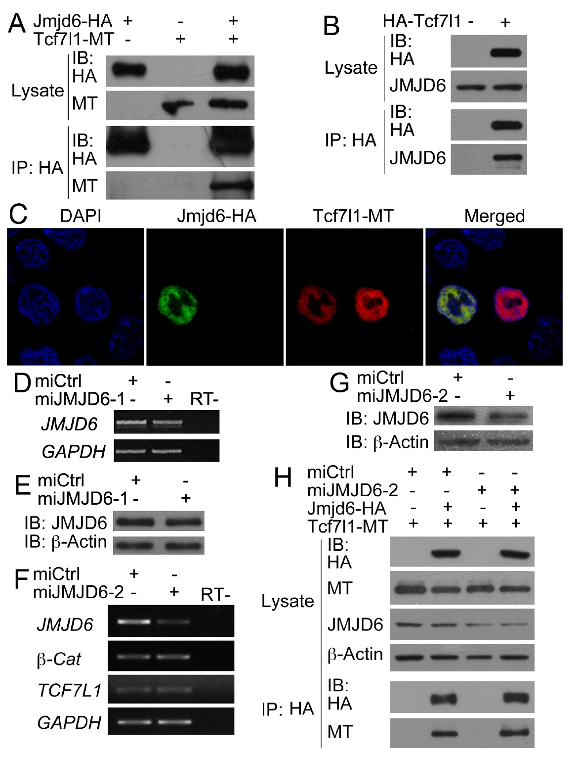 Jmjd6 and Tcf7l1 in HEK293T cells. B, overexpressed Tcf7l1 precipitated endogenous JMJD6 in