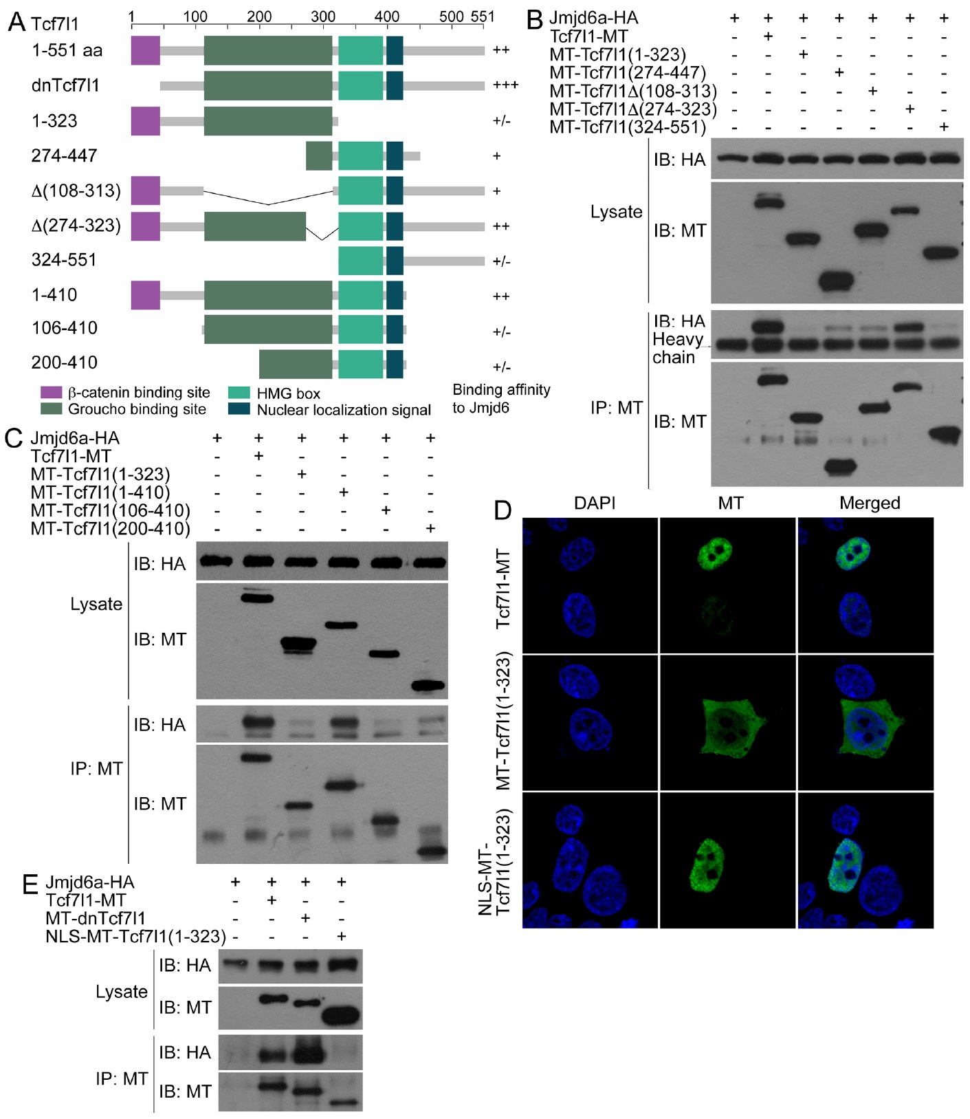 and C, Tcf7l1 deletion mutants exhibited different binding affinities to Jmjd6 as shown by Co-IP assays.