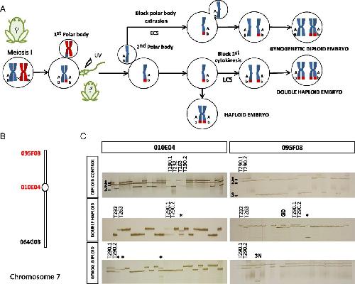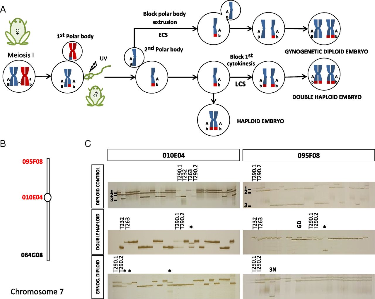 Fig. 2. Gynogenetic animals: production, confirmation of absence of paternal DNA, and verification of double haploids and gynogenetic diploids obtained by LCS and ECS, respectively. (A) To obtain gynogenetic offspring, the paternal contribution is blocked by UV-irradiation of sperm. Haploid (nonviable) embryos are rescued to viable diploidy either by suppressing second polar body formation with ECS to produce gynogenetic diploid embryos (heterozygous at many distal loci) or by blocking first cytokinesis using LCS and producing completely homozygous double haploids. (B) Chromosomal position of the two markers shown in C (red) on X. tropicalis chromosome 7 according to Wells et al. (36). (C) Genotypes for markers 010E04 (centromeric) and 095F08 (distal) in nongynogenetic diploid controls, double haploids, and gynogenetic diploids. A three-allele system for marker 010E04 allows the identification of the paternal contribution because the father is homozygous for allele 2, not present in the mothers (T290.1 and T290.2), heterozygous for alleles 1 and 3. Both triploid and nongynogenetic leaker individuals (labeled as 3n and *, respectively) were observed among true double haploids and gynogenetic diploids. The polymorphism for marker 095F08 (together with all markers included in Table 2) distinguishes true isogenic double haploids from gynogenetic diploids (GD) arising from spontaneous polar body failure. Double-haploid individuals are homozygous for all markers analyzed, whereas gynogenetic diploids are homozygous for centromeric markers, with a high probability of heterozygosity at distal loci. |