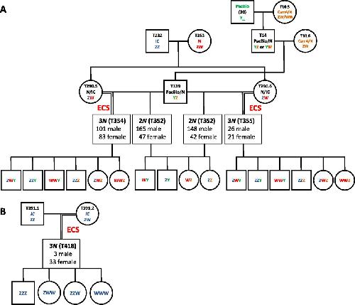 Fig. S3. Pedigrees and sex ratios of triploid and diploid siblings. (A) Pedigree and sex ratios of triploid and diploid siblings obtained from hybrid progenitors. The progenitors used in A were produced from interstrain crosses to obtain hybrids with high heterozygosity. The strain/stock of origin and proposed sex chromosome constitution are indicated (color-coded according to the strain/stock they come from; red: Nigerian; blue: Ivory Coast; green: PacBio; orange: Cam4/N hybrids). (B) Pedigree and sex ratios for triploids obtained from IC progenitors. The proposed sex chromosome constitutions are stated. |