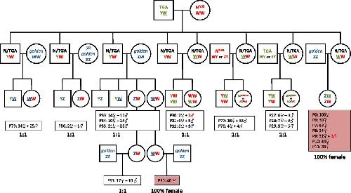 Fig. 4. Sex ratios and sex-linked marker inheritance in interstrain pairings prove the existence of Y, W, and Z sex chromosomes. The pedigree chart of the interstrain pairings performed shows the sex of the offspring obtained in different spawns (P0 to P91). All-female offspring were observed in two types of crosses (labeled in red), both involving golden ZZ males (obtained from breeding sex-reversed ZZ females with ZZ males). These offspring are possible only if the mothers are WW. Without sex reversal or gynogenesis, WW females can be produced only if males with a W chromosome (YW) are bred with ZW or WW females. Because all hybrid N/TGA females analyzed were WW, the sex chromosome constitution of the progenitors used to produce these hybrids was YW (TGA male) and WW (NNB1 female). Other TGA and NNB1 males used in this pedigree have a Y chromosome, although the data do not distinguish YZ from YW. The proposed sex chromosome constitution for all the animals in the pedigree chart is depicted together with a color code that indicates the strain or provenance (green: TGA; red: Nigerian; blue: golden). SR indicates a sex-reversed individual obtained by ethynylestradiol exposure (see pedigree chart in Fig. S1). |
