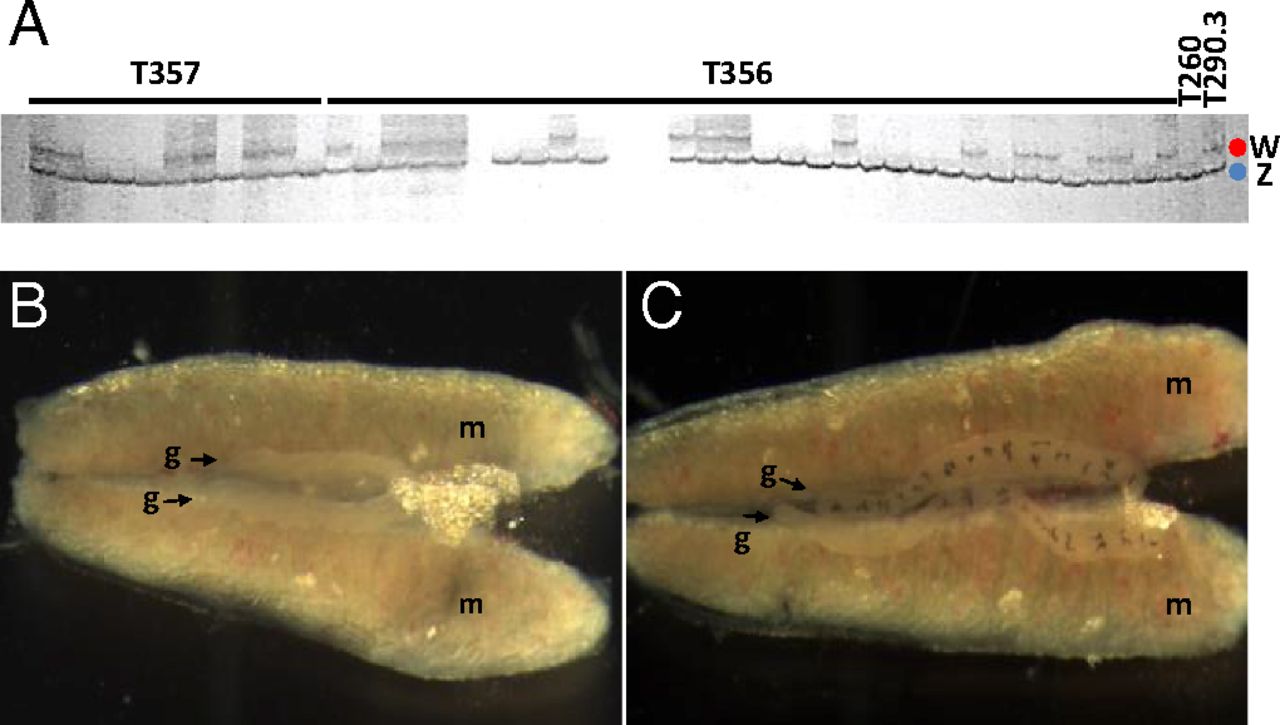 Fig. 1. Genotypic and phenotypic sex of X. tropicalis samples. (A) Genotypic sex of estrogen-treated animals (T356 and T357) was determined using several sex-linked SSLP markers with informative polymorphisms in their progenitors. The father of clutches T356 and T357 (T260) is homozygous for the SSLP marker shown in A; the mother (T290.3) is heterozygous, with the longer allele (red dot) located on the W chromosome and the shorter allele (blue dot) located on the Z chromosome (data obtained from grandparents). When this marker is used, ZW individuals have two bands, and ZZ individuals have only one. Sex-reversed males are identified as phenotypic females with a ZZ genotypic constitution for several informative sex-linked markers. (B and C) X. tropicalis gonads (g) attached to mesonephroi (m) from male (B) and female (C) tadpoles at stage NF 60. When the gonad has differentiated morphologically, the sex of tadpoles can be established by direct observation of the gonad under the stereoscope after dissection. |