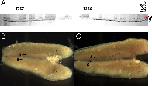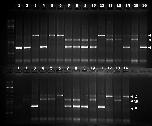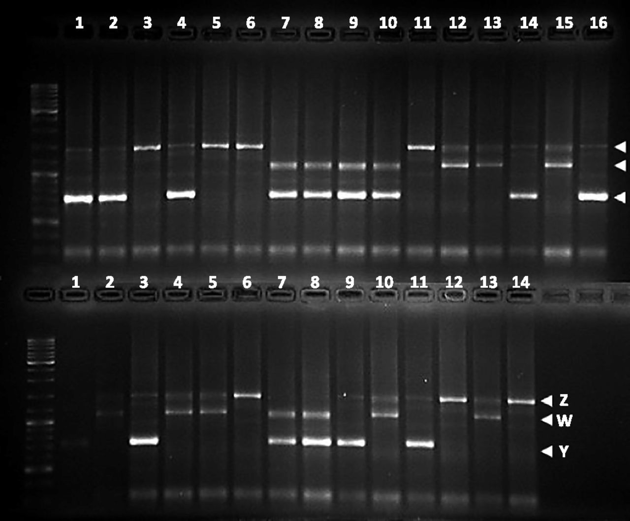 Fig. S4. Sex-linked marker in the offspring of cross X29. The genotype for a sex-linked marker is shown for the parents and offspring of cross X29. The father (M.Po1) is heterozygous for the alleles labeled as Z and Y (sample number 16 in upper row). The mother (T290.7) is heterozygous for alleles Z and W (sample number 15 in upper row). Phenotypic males are YZ (A: 1, 2, 4, 14, 15; B: 1, 3, 11), YW (A: 7, 8, 9, 10; B: 7, 8), or ZZ (A: 3, 5, 6, 11; B: 6, 12, 14). Phenotypic females can be only ZW (A: 12, 13, 15; B: 2, 4, 5, 10 and 13). A: upper row; B: lower row. |