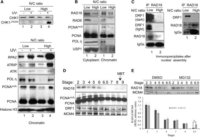 Figure 1. RAD18 Is Limiting near the MBT(A) Constitutive POLη chromatin binding and PCNAmUb at a low N/C ratio. Shown is a western blot of nucleosolic (top) or chromatin (bottom) fractions obtained from egg extracts containing sperm nuclei at a low (100 nuclei/μl) or high (1000 nuclei/μl) N/C ratio, UV-irradiated (+UV) or not (âUV), upon 50-min incubation at room temperature. Histone H3 served as the chromatin loading control.(B) Abundance of the indicated proteins (determined by western blot) remaining in the eggcytoplasm (left) or chromatin (right) after 90-min incubation with sperm chromatin at a low or high N/C ratio.(C) RAD18 interacts with DRF1 at a low N/C ratio in Xenopus egg extracts. Shown is a western blot of RAD18 immunoprecipitated (IP) from eggcytoplasm after nuclear assembly at a low or high N/C ratio. Short (light) and long (dark) exposures of DRF1 are shown. 10-fold more RAD18 immunoprecipitates at a low N/C ratio are also shown (right).(D and E) RAD18 and PCNAmUb are developmentally regulated. (D) Shown are western blots of total embryo protein extracts at the indicated stages of development (numbers) in the absence (DMSO) or presence of the proteasome inhibitor MG132 (30 μM; E). RAD18 quantification is expressed as relative optical density (ROD). Means ± SD are represented (ââp < 0.001). See also Figure S1.