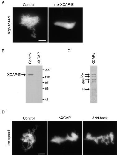 Figure 1. Condensin depletion from crude Xenopus egg extracts causes defects in chromosome condensation. (A) Chromosomes assembled in clarified extract to which buffer (Control) or 0.26 mg/ml XCAP-E antibody (+ α-XCAP-E) was added. Xenopus sperm nuclei were incubated in CSF extract for 90 min, and fixed and stained with Hoechst 33258. Bar, 10 μm. (B) Western blot analysis of crude Xenopus egg extracts depleted using IgG (Control) or XCAP-E and XCAP-G antibodies (ΔXCAP), and probed with affinity-purified XCAP-E antibody, which recognized a single band of 140 kD in control extract. (C) Silver-stained 8% gel of Xenopus condensin complex purified from Xenopus egg extract using XCAP-G antibody–coupled beads and eluted using XCAP-G peptide. All five subunits of the complex are present, though XCAP-H appears lighter and more diffuse. (D) Chromosomes assembled in control and condensin-depleted crude extracts. Xenopus sperm nuclei were added to extracts, which were then cycled through interphase and back into mitosis. The reactions were fixed in metaphase, 60 min after initiation of mitosis. Bar, 10 μm.