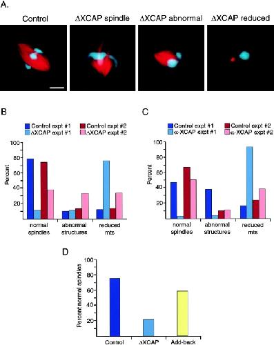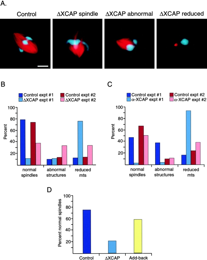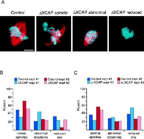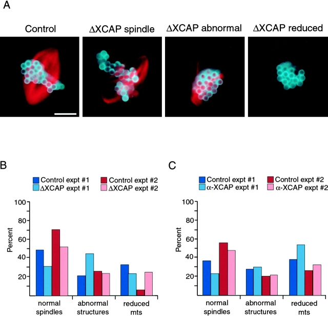 Figure 6. Condensin inhibition reduces the fidelity of DNA bead spindle assembly. (A) Microtubule structures formed around DNA beads in extracts depleted using IgG (Control) or condensin antibodies (ΔXCAP) that were fixed in metaphase 90 min after initiation of mitosis. The three ΔXCAP images show structures representative of the three categories quantified in B and C: normal spindles, abnormal structures, and reduced microtubules. Bar, 10 μm. (B) Quantification of the effect of condensin depletion on bead spindle assembly in two separate experiments (red and blue bars). Samples were fixed 90 min after the start of mitosis. Each cluster of 10 or more DNA beads was examined and the microtubule array surrounding it was assigned to the categories depicted in A. For each reaction, >100 structures were counted. Percent of bead clusters in each category are depicted. (C) Quantification of the effect of XCAP-E antibody addition on bead spindle assembly in two separate experiments. To each spindle assembly reaction, either buffer (Control) or 0.26 mg/ml α-XCAP-E antibody (α-XCAP) was added at the start of mitosis. Samples were fixed at 90 min, and the microtubule structures were grouped into the categories depicted in A.