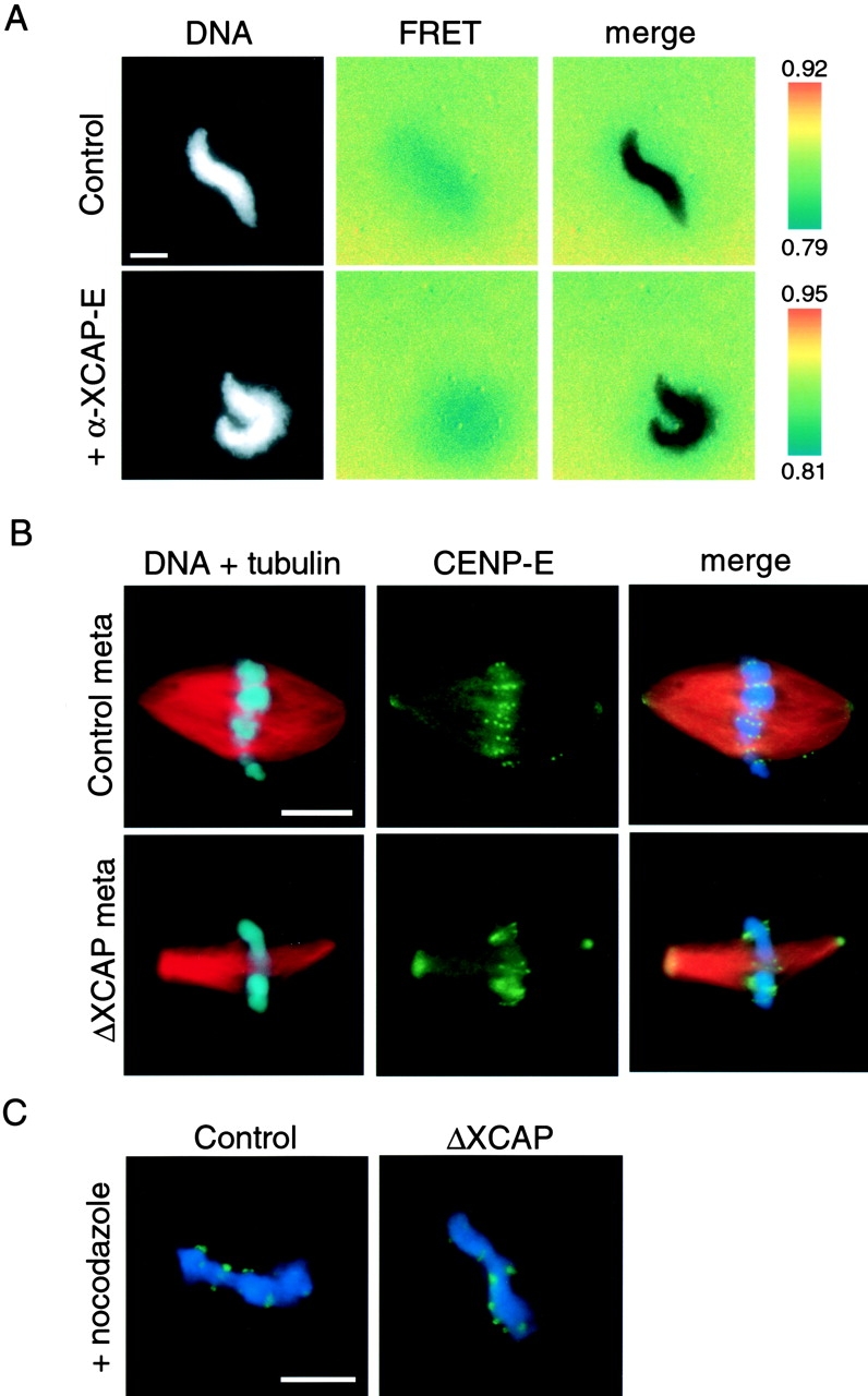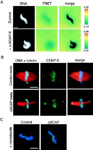 Figure 5. Depletion of the condensin complex does not affect the Ran-GTP gradient, but disrupts kinetochore morphology. (A) RanGTP was visualized by addition of a probe that shows a loss of FRET when bound to RanGTP. Fluorescence images show sperm nuclei, the FRET ratio signal (IFRET/ICFP), and an overlay. Ratios range from low FRET (blue) to high FRET (red). Gradients appeared indistinguishable surrounding chromosomes in clarified extracts treated with buffer or α-XCAP-E. Bar, 10 μm. (B) Immunofluorescence images of CENP-E (green) in spindles formed in extracts depleted using IgG (Control) or condensin antibodies (ΔXCAP), revealing aberrant kinetochore morphology in the absence of condensin. Samples were fixed 60 min after the induction of mitosis. Bar, 10 μm. (C) Addition of 1 μM nocodazole to metaphase reactions increased the CENP-E signal and partially alleviated its distortion in ΔXCAP extracts. Bar, 10 μm.