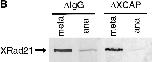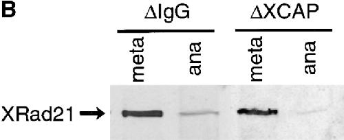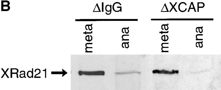 Figure 7. Condensin depletion does not affect CENP-E localization in anaphase or XRad21 degradation. (A) CENP-E staining (green) in spindles formed in extracts depleted using IgG (Control) or condensin antibodies (ΔXCAP). Samples were fixed 15 min after anaphase initiation. Bar, 10 μm. CENP-E is localized to regions of DNA that is stretched toward the spindle poles (arrow), suggesting that the kinetochores are still functional. (B) Analysis of XRad21 degradation in anaphase. Chromosomes were purified from extracts depleted with IgG (control) or condensin antibodies (ΔXCAP) in either metaphase or anaphase. Proteins were separated on an 8% gel and blotted using affinity-purified XRad21 antibodies, revealing a similar reduction of XRad21 in the presence and absence of condensin. The blot was also probed with antibodies against topoII as a loading control (not depicted).