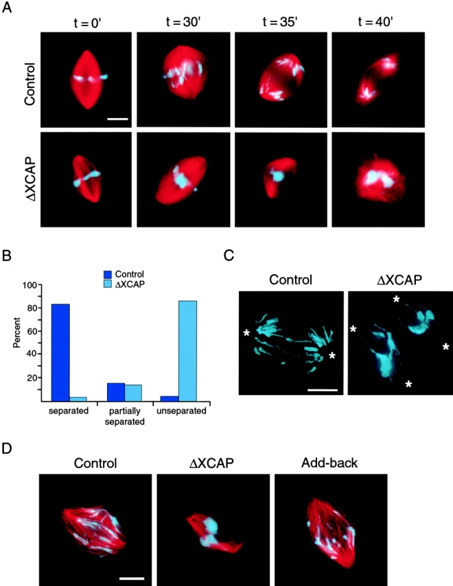 Figure 3. Depletion of the condensin complex from Xenopus egg extracts causes defects in anaphase chromosome segregation. (A) Chromosome segregation in extracts depleted with IgG (Control) or condensin antibodies (ΔXCAP). Once metaphase spindles were assembled (t = 0'), anaphase was induced and samples were fixed at 30, 35, and 40 min. Bar, 10 μm. (B) Quantification of the effect of condensin depletion on chromosome segregation. One representative experiment is shown. Samples were fixed 40 min after anaphase initiation, and the chromosomes in each spindle were classified as completely separated, partially separated, or unseparated. 188 and 162 structures were counted for the control and condensin depletion (ΔXCAP), respectively. Percent sperm nuclei in each category is depicted. (C) Deconvolution microscopy of chromosomes during anaphase in control and condensin-depleted (ΔXCAP) extracts. The samples were fixed 35 min after anaphase induction. The poles of each spindle are marked with asterisks (*). Two side-by-side spindles are shown in the condensin-depleted extract. Bar, 10 μm. (D) Chromosome segregation in extracts depleted with IgG (Control) or XCAP antibodies (ΔXCAP), and in the XCAP-depleted extract to which purified Xenopus condensin complex was added (Add-back). The structures were fixed 30 min after anaphase initiation. Bar, 10 μm.