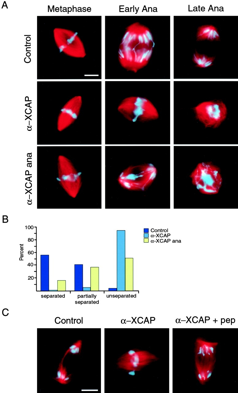Figure 4. Inhibition of the condensin complex either before mitosis or after anaphase initiation causes chromosome segregation defects. (A) Segregation of sperm chromosomes in Xenopus egg extracts in the presence of buffer or 0.26 mg/ml XCAP-E antibody, added either as the extract was entering mitosis (α-XCAP) or immediately after anaphase induction (α-XCAP ana). Samples were fixed at metaphase (Metaphase), and early and late anaphase (Early Ana and Late Ana). Bar, 10 μm. (B) Quantification of the effect of condensin antibody addition on chromosome segregation. Spindles were fixed 40 min after anaphase induction, and the chromosomes were classified as completely separated, partially separated, or unseparated. For each reaction, >100 structures were counted. (C) Chromosome segregation in the presence of IgG (Control), XCAP-E antibody preincubated with buffer (α-XCAP), or XCAP-E antibody preincubated with antigen (α-XCAP + pep). Samples were fixed 35 min after anaphase induction. Bar, 10 μm. Videos 1–6 are available at http://www.jcb.org/cgi/content/full/jcb.200303185/DC1.