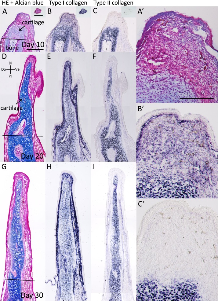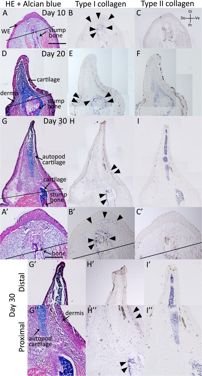 Fig 2. Type I and type II collagen expression patterns in the axolotl blastema.(A-C) The axolotl blastema at 10 days postamputation. (A) HE and Alcian blue staining. (B) Type I collagen expression was analyzed by in situ hybridization. Type I collagen-expressing cells were observed in the blastemamesenchyme and the proximalbone wound region. (C) There was no detectable type II collagen expression. (D-F) At 20 days postamputation. (D) HE and Alcian blue staining. (E) Type I collagen expression was observed in the dermal layer and the proximalbone wound region. (F) Type II collagen expression was observed in the Alcian blue-positive cartilaginous region. (G-I) At 30 days postamputation. (G) HE and Alcian blue staining. (H) Type I collagen expression was observed in the dermal layer and the proximalbone wound region. (I) Type II collagen expression was observed in the Alcian blue-positive cartilaginous region. A-I are shown at the same magnification. Aâ, Bâ, Câ, Gâ, Gâ, Hâ, Hâ, Iâ and Iâ are higher magnification images of A, B, C, G, H and I, respectively and Aâ-Câ, Gâ-Hâ and Gâ-Hâ are same magnification, Scale bar in A is 1 mm. Scale bar in Aâ is 500 μm. Black bars indicate amputated lines. Black arrowheads indicate type I collagen expression.