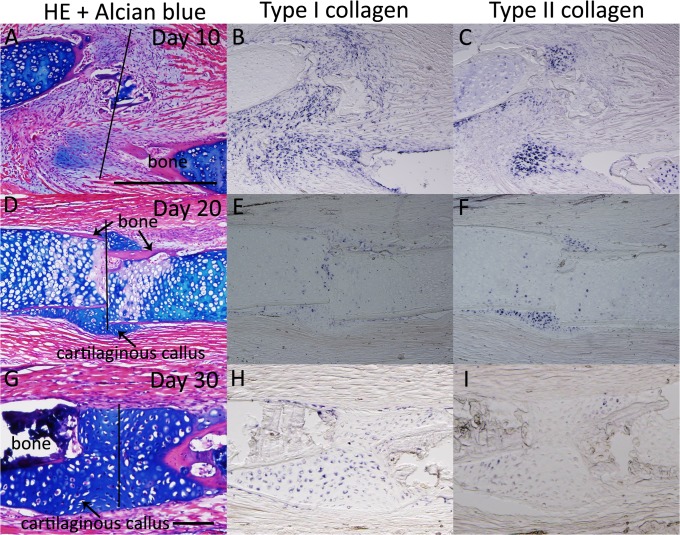 Fig 3. Type I and type II collagen expression patterns during bone fracture healing in axolotl.(A-C) The axolotl fracture at 10 days postwounding. (A) HE and Alcian blue staining. (B) Type I collagen-expressing cells were observed at the bone wound site. (C) The type II collagen expression area was smaller than the type I collagen expression area. (D-F) The axolotl fracture at 20 days postwounding. (D) HE and Alcian blue staining. A cartilaginous callus was observed in the fracture plane. (E) Type I collagen expression. (F) Type II collagen expression. (G-I) The fracture at 30 days postwounding. (G) HE and Alcian blue staining. (H) Type I collagen expression. (I) Type II collagen expression. A-F are shown at same magnification. G-I are at same magnification. Scale bars in A and G are 500 μm. Black bars indicate the bone fracture plane.