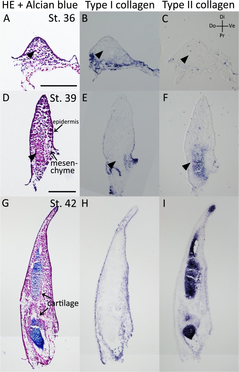 Fig 4. Type I and type II collagen expression patterns in the Xenopus limb bud.(A-C) The st. 52 Xenopus limb bud. (A) HE and Alcian blue staining. (B) Type I collagen expression. (C) Type II collagen expression. (D-F) The distal part of the st. 54 Xenopus limb bud. (D) HE and Alcian blue staining. (E) Type I collagen expression. (F) Type II collagen expression. (G-I) The distal part of the st. 56 Xenopus limb bud. (G) HE and Alcian blue staining. (H) Type I collagen expression. (I) Type II collagen expression. A-C are shown at same magnification. D-I are at same magnification. Scale bars in A, B insert, D are 500 μm, 200 μm, 100 μm, respectively. Arrowheads indicate presumed cartilaginous regions.