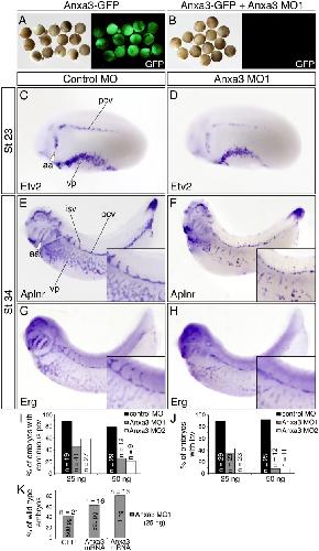 Fig 6. Anxa3 gain-of-function has no effect on developing blood vessels in vivo.(A,B) Whole-mount in situ hybridization for Aplnr expression in GFP and Anxa3 mRNA injected embryos (stage 34, lateral views). No changes in overall vessel morphology or levels of Aplnr expression were observed. (C) The percent (%) of GFP and Anxa3 mRNA injected embryos displaying normal vascular formation, as assessed by Aplnr expression, are shown. Aortic arches, aa; intersomitic vessel, isv; n, number of embryos assayed; posterior cardinal vein, pcv and vascular plexus, vp. |