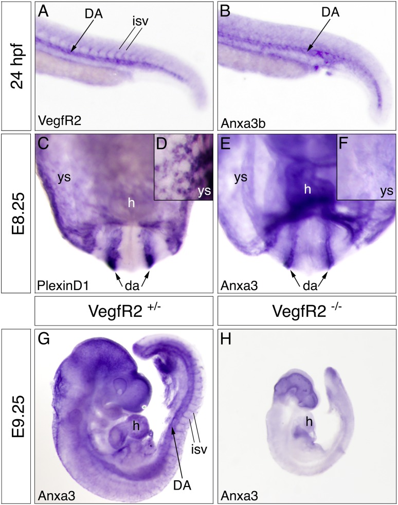 Fig 3. Expression of Anxa3 in the endothelial lineage is conserved across multiple species.(A,B) Whole-mount in situ hybridization analysis for vascular endothelial growth factor receptor 2 (VegfR2) and Anxa3b expression in Danio rerio embryos, 24 hours post fertilization (hpf). Close-up, lateral views of the tail regions are shown. Anxa3b transcripts are restricted to the developing dorsal aorta (DA), whereas VegfR2 is also expressed in the intersomitic vessels (isv). (C-F) Embryonic (E) day 8.25 mouse embryos were assayed for Anxa3 and the vascular marker PlexinD1 by whole-mount in situ hybridization (anterior views). Similar to PlexinD1, Anxa3 is observed in the paired dorsal aortae (da, arrows) and heart (h) region of the embryo. Anxa3 is absent in the extra-embryonic vessels of the yolk sac (ys) that are marked by PlexinD1 expression. This is highlighted in close-up views of ys from PlexinD1 and Anxa3 stained E8.25 embryos (D,F). (G,H) E9.25 heterozygous (+/-) and homozygous (-/-) VegfR2 embryos analyzed for Anxa3 expression by in situ hybridization (lateral views). Anxa3 is detected in the dorsal aorta (DA), intersomitic vessels (isv) and heart (h) region of VegfR2+/- embryos, while VegfR2-/- null embryos, which lack all blood vessels, displayed no observable vascular staining of Anxa3 (background staining is detected in the head and just outside the heart region). |