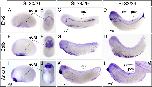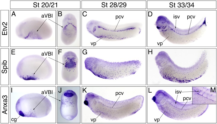 Fig 1. Anxa3 is expressed in endothelial and myeloid cells of developing Xenopus laevis embryos.Whole-mount in situ hybridization analysis of Etv2, SpiB and Anxa3 transcripts in Xenopus embryos at stages (St) 20/21, 28/29 and 33/34 (A-M). Lateral (A,C,D,E,G,H,I,K,L) and ventral (B,F,J) views show a close association of Anxa3 with the developing endothelial (Etv2) and myeloid (SpiB) lineages. At early stages (I,J), Anxa3 is expressed in the anterior ventral blood island (aVBI), which consists of adjacent Etv2 (A,B) and SpiB (E,F) expressing cells. At St 28/29 and 33/34, Anxa3 (K,L) is detected in the major vascular structures highlighted by Etv2 expression (C,D): the posterior cardinal vein (pcv), vascular plexus flank (vp) and intersomitic vessels (isv). (M) High magnification view of an embryo showing strong expression of Anxa3 in the pcv and isv. Anxa3 is also observed in the myeloid cells (marked by SpiB) that migrate throughout the entire embryo (compare the G,H to K,L). Throughout development, Anxa3 is also present in the cement gland (cg). |