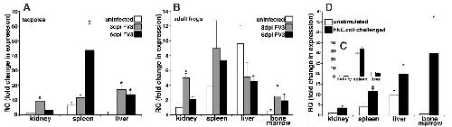 Fig. 4. Quantitative analysis of colony-stimulating factor-1 receptor (CSF1R) tissue gene expression in Frog Virus 3 (FV3) and heat-killed E. coli challenged tadpoles and adult X. laevis. Tadpoles (Stg. 54) and adult frogs (2 years-old) were infected by ip injections with 1x104 and 5x106 PFU of FV3, respectively. Alternatively, tadpoles and adult frogs were injected respectively with 10ml and 100ml of heat-killed (hk) E. coli. (A) FV3-infected tadpoleCSF1R gene expression. (B) FV3-infected tadult frog CSF1R gene expression. (C) Heat-killed E. coli-stimulated tadpoleCSF1R gene expression. (D) Heat-killed E. coli-stimulated adult frogCSF1R gene expression. All gene expression analysis was performed via the delta^delta CT method using X. laevis CSF1R-specific primers, the expression examined relative to the GAPDH endogenous control and normalized against respective uninfected kidney expression. Results are means ± SEM, N=4 and the (*) above lines denotes significant difference between tissues indicated by the lines, P<0.05.