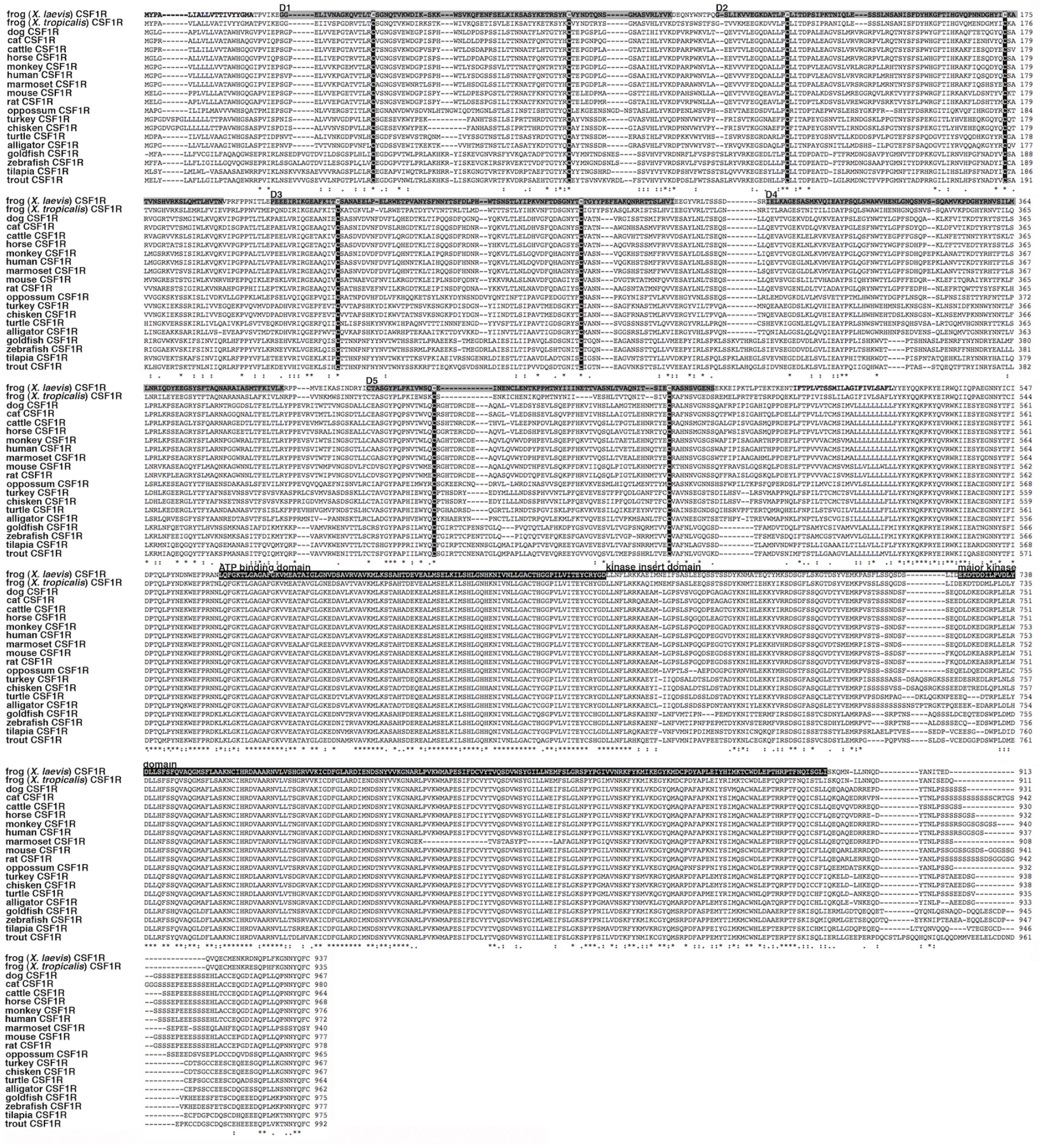 Fig. 1. Amino acid alignment of X. laevis CSF1R with other vertebrate CSF1R protein sequences. Protein alignments were performed using ClustalW2 server. Fully conserved residues are indicated by an asterisk (*), partially conserved and semi-conserved substitutions are represented by “:” and “.”, respectively. The X. laevis CSF1R signal peptide is in bold, the immunoglobulin-like domains are indicated as D1-D5, the evolutionarily conserved structural cysteines are in white text within black boxes and the transmembrane domain is also in bold face. As indicated overhead; the X. laevis CSF1R ATP binding and tryrosine kinase major catalystic domains are in white text within black boxes while the kinase insert domain is indicated by an overhead line.