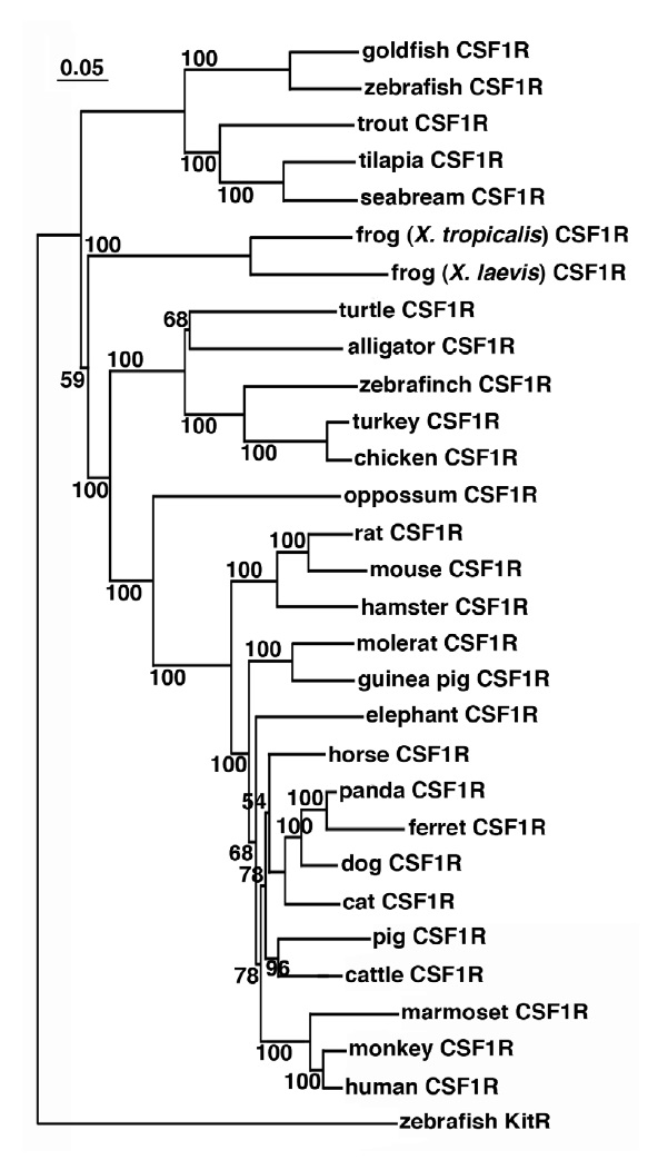 Fig. 2. Phylogenetic analysis of teleost, amphibian, reptile, avian and mammalian colony-stimulating factor-1 receptor (CSF1R) molecules. The phylogenetic tree was constructed from multiple deduced amino acid sequence alignments using the neighbor joining method and bootstrapped 10,000 times (denoted as %). The zebrafish KitR was used as outgroup to root the tree.