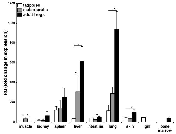 Fig. 3. Quantitative colony-stimulating factor-1 receptor (CSF1R) tissue gene expression analysis of tadpoles (Stg. 54), metamorphic (Stg. 64) and adult (2 years-old) frogs. Tissues from three individuals (N =3) were used for all expression studies, the expression was performed via the delta^delta CT method using X. laevis CSF1R-specific primers. The expression examined relative to the GAPDH endogenous control and normalized against the tadpolemuscletissue expression. Results are means ± SEM, N=4 and the (*) above lines denotes significant difference between tissues indicated by the lines, P<0.05.