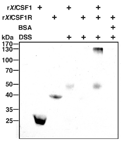 Fig. 5. In vitro rXlCSF1 and rXlCSF1R cross-linking studies. One microgram each of rXlCSF1, rXlCSF1R, rXlCSF1 + rXlCSF1R and BSA + rXlCSF1R were incubated in APBS (100ml final volume) for 30 min and cross-linked for 30 min using 2.5 mM DSS, final concentration. Cross-linking reactions were terminated by addition of 50 mM Tris (final concentration). Reactions were resolved and visualized using SDS-PAGE and western blot against the V5 epitopes on the recombinant proteins.
