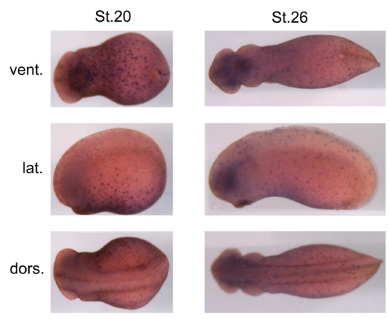 Fig. 1. In situ hybridization for zfp36 using a 3â UTR probe. Stages 20 and 26 X. tropicalis embryos were fixed and treated for ISH with a probe targeting the 3â UTR of zfp36 mRNA. Ventral (vent.), lateral (lat.) and dorsal (dors.) views of representative embryos are shown as indicated.