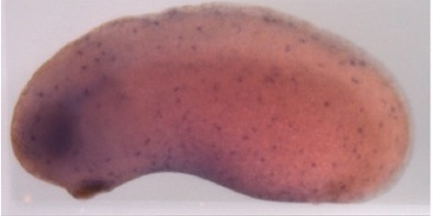 zfp36 (ZFP36 ring finger protein) gene expression in Xenopus tropicalis embryo, assayed via in situ hybridization, NF stage 32, lateral view, anteriorleft, dorsal up