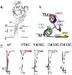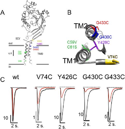 Fig 2. Native cysteines and cysteine substitutions in the transmembrane domain of ASIC1a.A: Model structure of a human ASIC1a subunit based on the chicken ASIC1 crystal structure as published elsewhere [4]: the subunit is made of 2 transmembrane α helices (TM1 and TM2); the cysteines C49, C59 and C61 in the transmembrane α helix 1 (TM1) are shown in green. The substituted cysteines G430C and G433C are in the TM2, and V74C and Y426C are located at the entrance of the channel pore in the extracellular vestibule (ECV). B: Top view of the transmembrane α helices TM1 and TM2 of a single ASIC1a subunit, with the pore lining residues G433C and G430C according to Li et al. 2011. C: Representative recordings of ASIC1a currents elicited at pH 5.5 in the absence (black) or in the presence (red) of 100 μM Cd2+ in xenopus oocytes expressing either ASIC1a wt or the V74C, Y426C, G430C, G433C mutants. |