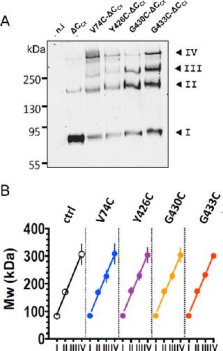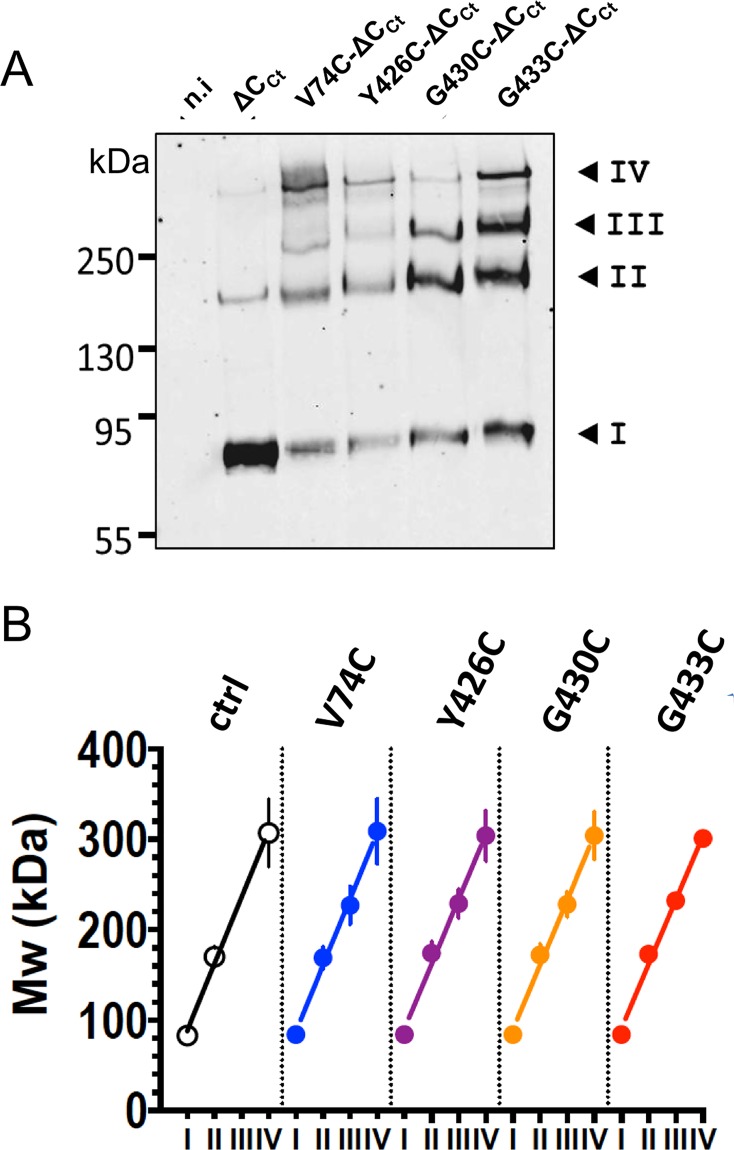 Fig 3. ASIC1 oligomeric states resolved by SDS-PAGE after crosslinking with BMOE.A: Anti-Anti-His-tag western blot of the surface-biotinylated protein fractions from either non-injected oocytes (n.i.), or oocytes expressing either the His8-tagged form of ASIC1a-ΔCCt (ΔCCt), lacking cysteines in the C-terminus, or the corresponding cysteine-substitution mutants V74C-ΔCCt, Y426C-ΔCCt, G430C-ΔCCt, and G433C-ΔCCt. Crosslinking with 2 mM BMOE was performed at the cell surface; the cell-surface biotinylated proteins were affinity-purified on streptavidin beads. Numbers I to IV, designate the four most prominent bands. B: Apparent Mw values of the ASIC1 oligomers (kDa, mean ±SD) estimated for each of the four main bands (I to IV) for the different constructs, as in A. Lines represents linear regression of the average values, with slopes ranging from 71 ± 4.2 to 73.8 ± 4.6 kDa for the different ASIC1a cDNA constructs. |