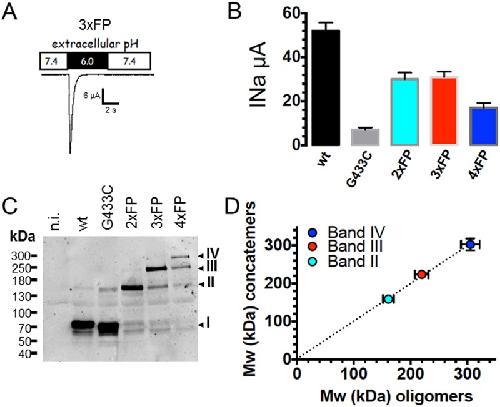 Fig 5. Functional expression of concatenated ASIC1a fusion proteins.A: Representative recording of an ASIC1a current in Xenopus oocytes expressing a fusion protein made of three ASIC1a subunit proteins, each with intact C-termini, and linked in a head to tail fashion (3xFP). B: Average (mean ± SD) of ASIC1a currents elicited at pH 6.0 measured in Xenopus oocytes expressing monomeric hASIC1a (wt or G433C mutant) or fusion proteins made of two (2xFP), three (3xFP), or four (4xFP) ASIC1a subunit proteins. All constructs comprise a single, N-terminal, His8 tag. C: Anti-ASIC1a western blot obtained from oocytes expressing the same ASIC1a constructs as in B; I, II, III, IV have the same meaning as in Fig 3A. D: Relationship between the molecular weights of bands I, II, III, IV estimated from ASIC1a oligomers crosslinked with BMOE (as in Fig 3A) and the size (kDa) of dimeric (gray), trimeric (red) and tetrameric (blue) ASIC1a fusion proteins; the straight dotted line represents the linear regression fit forced to the axes origin; the slope of the regression line is 0.993 ± 0.052. |