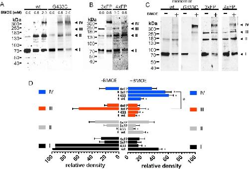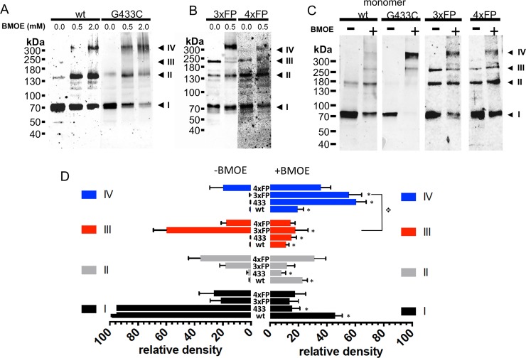 Fig 6. Oligomeric states of ASIC1a trimeric and tetrameric fusion proteins at the surface of cells expressing functional ASIC1a.A-B: Anti-ASIC1a western blot of surface biotinylated fractions of oocytes, treated with vehicle or with BMOE (0.5 or 2 mM) before lysis, expressing either ASIC1a wt or G433C (A) or 3ASICFP (3xFP) or 4ASICFP (4xFP) (B). C: Anti-ASIC1a western blot of ASIC1a in cell-surface biotinylated fractions of CHO cells expressing monomeric ASIC1a wt, or G433C mutant, 3xFP, or 4xFP fusion proteins with or without treatment with BMOE before lysis. I, II, III, IV have the same meaning as in previous figures. D: Relative intensities (mean ±SD) of each of the 4 bands (I to IV) ASIC1a oligomers from cell-surface biotinylated fractions of Xenopus oocytes and CHO cells expressing ASIC1a (wt, n = 17), or G433C (433, n = 17) monomeric forms, or 3xFP (n = 8), or 4xFP (n = 8) fusion proteins treated with either vehicle or 0.5 mM BMOE. Symbol * denotes p<0.01 for comparison between condition -BMOE and +BMOE, ❖ p<0.01 for the indicated comparison. |