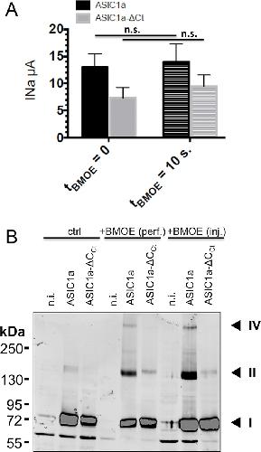 Fig 1. Effects of intracellularly applied BMOE on hASIC1a activity and oligomerization.A: Currents were recorded in cut-open oocytes expressing either wild type ASIC1a (black bars n = 18) or ASIC1a-ÎCCt lacking cysteines in the C-terminus (grey bars, n = 17) before and after 10 s of intracellular perfusion with 2 mM BMOE (+BMOE). Bars represent mean ± SE. B: Anti-ASIC1a western from oocytes, either non-injected (n.i.), or expressing ASIC1a or ASIC1a-ÎCCt, untreated (left), or treated with 2 mM BMOE by internally perfusion (perf.) or intracellular injection (inj.). Numbers I, II, and IV designate the most prominent bands that are specific for ASIC1a, II and IV having apparent weight sizes that are, respectively, twice and four times that of I. |