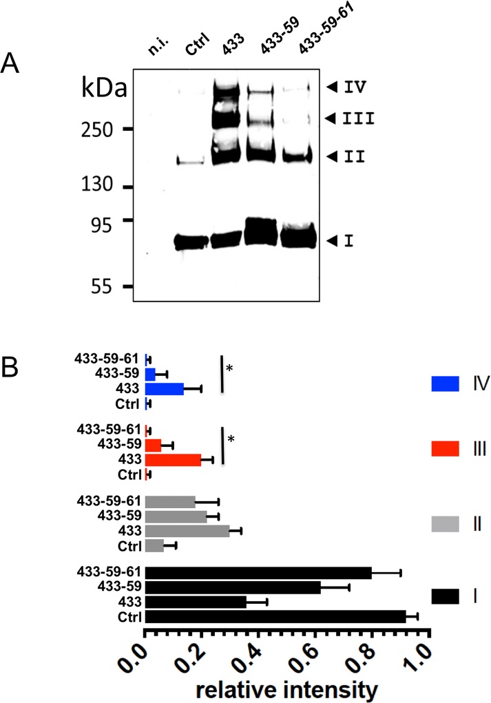 Fig 4. Contribution of cysteines C59 and C61 in the first transmembrane helix (TM1) to the stabilization of the ASIC1a complex by BMOE.A: ASIC1a oligomeric states, resolved by SDS-PAGE under reducing conditions and detected by anti-His-tag western blotting (same experimental procedure as in Fig 3A), of the His8-tagged forms of ASIC1a-ΔCCt as control (Ctrl), and the cysteine substitution mutant G433C-ΔCCt (433), G433C-C59V-ΔCCt (433–59) or G433C-C59V-C61S-ΔCCt (433-59-61). Numbers I to IV have the same meaning as in Fig 3. B: Relative intensities (mean ±SEM, n = 4) of each of the 4 bands (I to IV) for ASIC1a identified on SDS-PAGE from cells expressing ASIC1a-ΔCCt, (C), G433C-ΔCCt (433) G433C-C59V-ΔCCt (433–59) and G433C-C59V-C61S-ΔCCt (433-59-61). The average molecular weight estimated for the four bands I, II, III, IV are respectively 80±10, 160±6, 230±9 and 300±19 kDa (Mw±SD, n = 4) for the G433C-ΔCCt, G433C-C59V-ΔCCt, and G433C-C59V-C61S-ΔCCt constructs. * denotes p<0.01 |