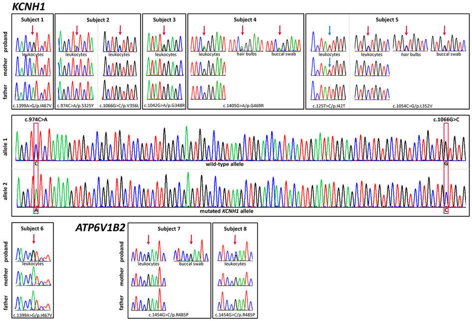 Supplementary Figure 1: Sequence electropherograms of individuals with KCNH1 or ATP6V1B2 mutation.. Sequence electropherograms showing the de novo origin of the identified KCNH1 and ATP6V1B2 missense mutations in subjects 1–8 (upper and lower panels, indicated by red arrows). The heterozygous state of three mutations was documented in peripheral leukocytes, hair bulb and/or buccal cells of subjects 4, 5 and 7, indicating germline origin. An additional previously annotated (ExAC database) heterozygous KCNH1 variant, c.125T>C (p.Ile42Thr), was present in subject 5 and his healthy mother (indicated by blue arrows). By cloning the KCNH1 exon 7–containing amplicon of subject 2 followed by sequencing, we determined the haplotypes and found that the two identified de novo changes c.974C>A and c.1066G>C are in cis (wild-type allele and mutated KCNH1 allele in the middle panel; mutated nucleotides are framed).