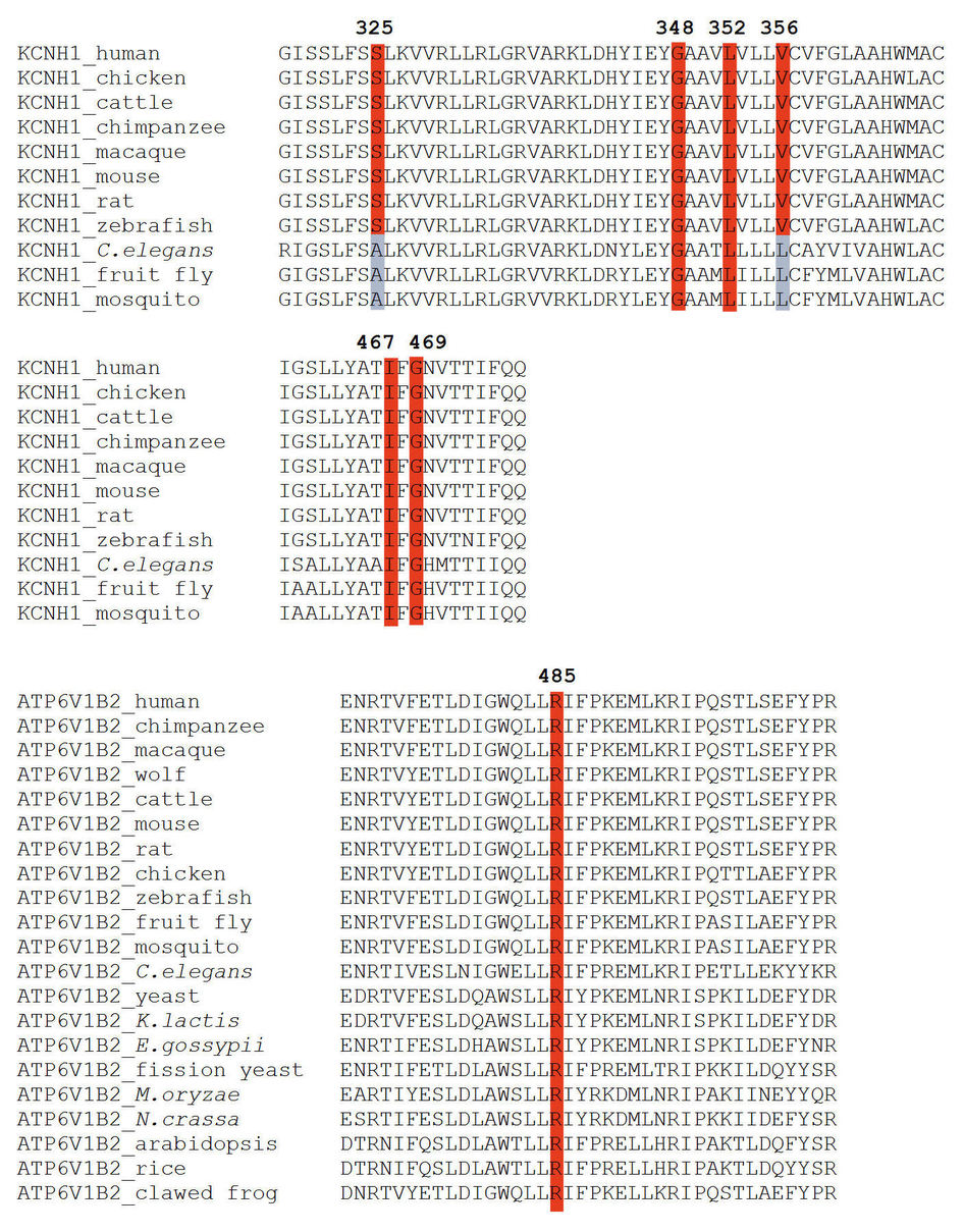 Supplementary Figure 2: Multiple protein sequence alignments around the KCNH1 and ATP6V1B2 amino acid substitutions from different species.
