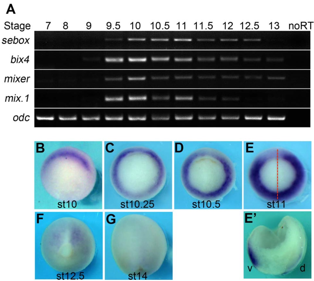 Fig. 1. Dynamic expression of Xenopus Sebox during gastrulation. A: The expression of sebox and other Mix/Bix genes during early Xenopus