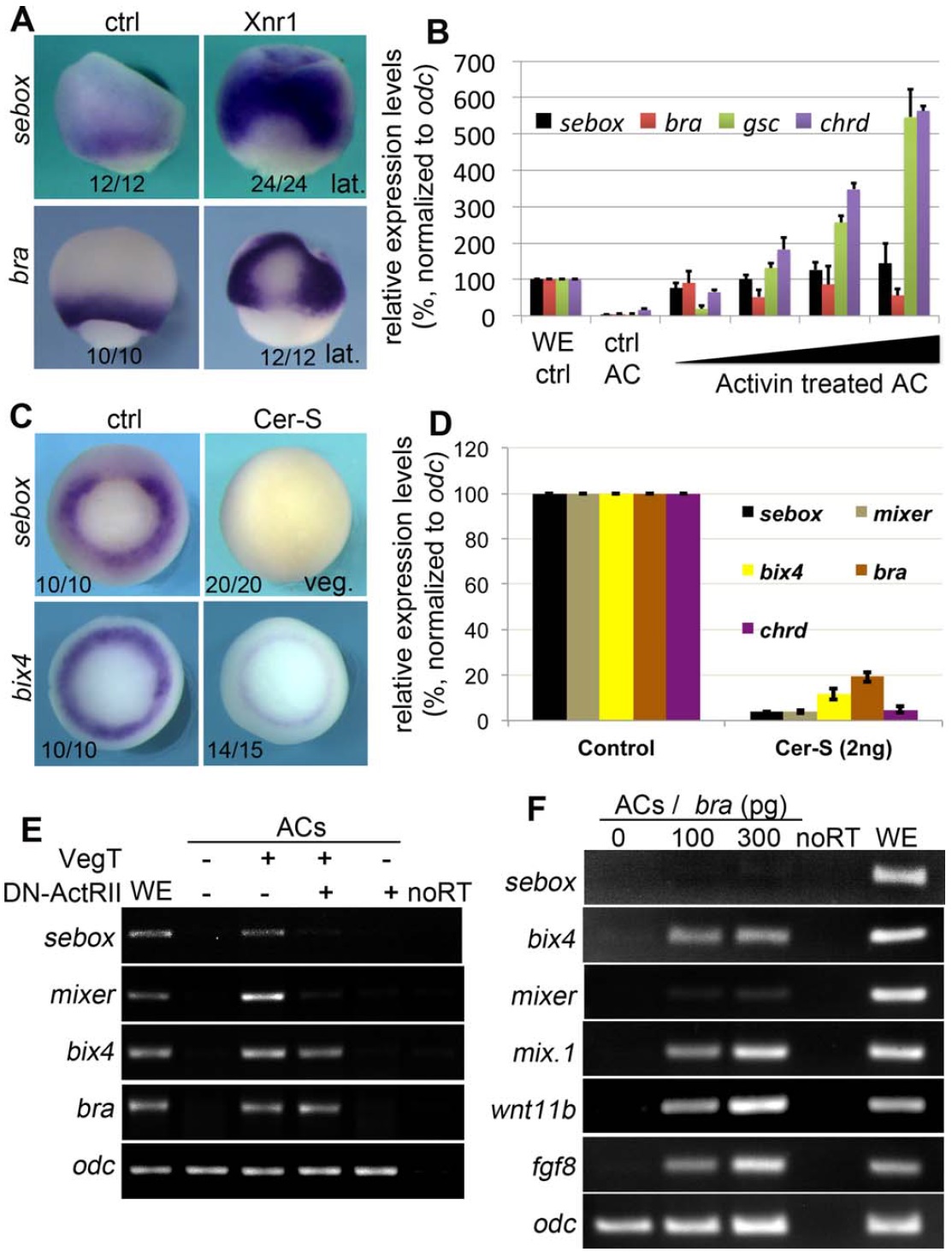 the animal pole upward. B: qRT-PCR analysis of the expression of sebox, bra, goosecoid (gsc) and chordin (chrd) in animal caps (ACs) in response