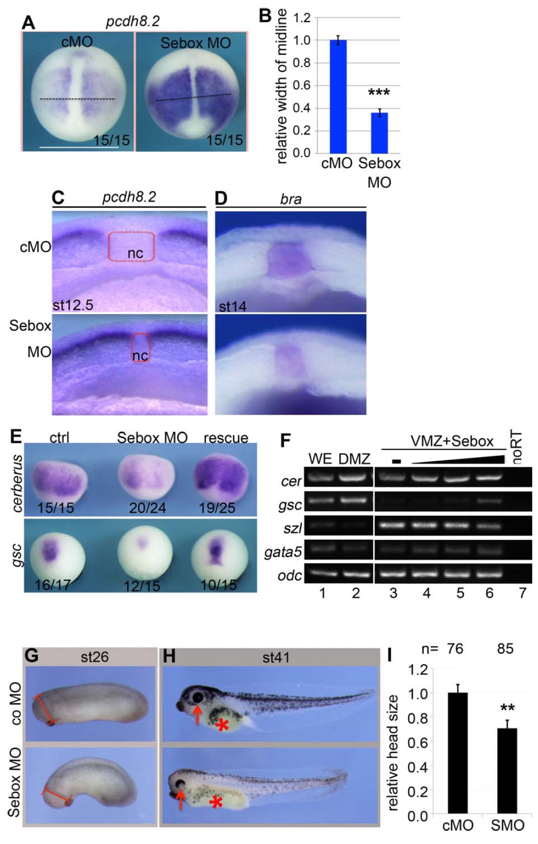 embryos, measured by drawing a line from the cement gland to the midbrain area in the control or Sebox-depleted embryos, as indicated in G.