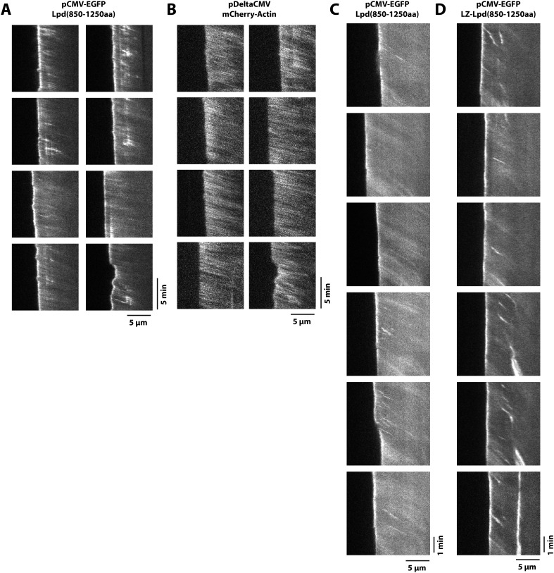 Figure 4âfigure supplement 2. Retrograde flow of GFP-Lpd (850â1250aa) and GFP-LZ-Lpd (850â1250aa) with the actin cytoskeleton.(A, B) Representative kymographs showing retrograde flow of (A) monomeric GFP-Lpd850â1250aa and (B) mCherry-Actin in XTC cells. Images were acquired every 5 s. Scale bars, 5 µm and 5 min. (C, D) Representative kymographs showing retrograde flow of (C) monomeric GFP-Lpd850â1250aa and (D) dimeric GFP-LZ-Lpd850â1250aa. Compared to (A, B), images were acquired every 2 s. Scale bars, 5 µm and 1 min.DOI: http://dx.doi.org/10.7554/eLife.06585.010 |