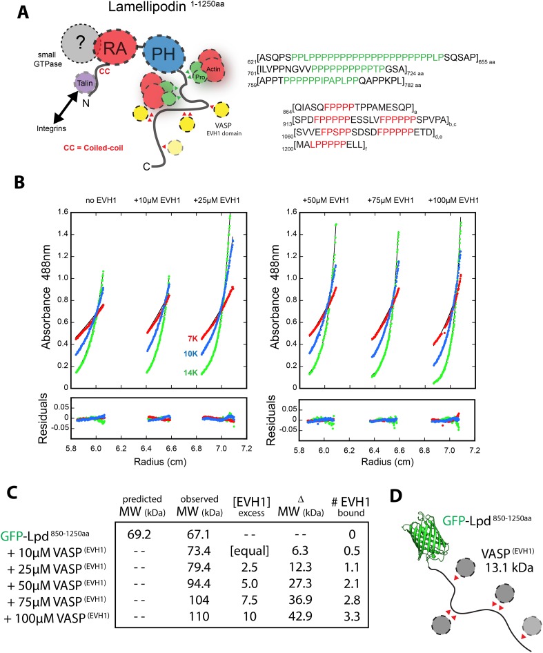 Figure 5—figure supplement 1. Lpd-VASP binding stoichiometry determined by sedimentation equilibrium.(A) Cartoon showing domain organization of human Lpd (1–1250aa). (B) Analytical ultracentrifugation sedimentation equilibrium traces for GFP-Lpd850−1250aa in the absence (left) and presence of 10, 25, 50, 75, 100 µM VASP1−114aa EVH1 domain. (C) Table showing the predicted and observed molecular weight of GFP-Lpd850−1250aa in absence and presence of different VASP1−114aa EVH1 domain protein concentrations. (D) Cartoon showing GFP-Lpd850−1250aa with VASP1−114aa EVH1 domains (grey spheres) binding to FPPPP sites (red triangles). Based on the observed binding stoichiometry between GFP-Lpd850−1250aa and VASP1−114aa, we hypothesize that steric hindrance allows only a single EVH1 domain to interact with the tandem FPPPP motifs (i.e., SPDFPPPPPESSLVFPPPPPSPVPA and SVVEFPSPPSDSDFPPPPPETD). The crystal structure of GFP was derived from Yang et al. (1996) (1GFL.pdb).DOI: http://dx.doi.org/10.7554/eLife.06585.015 |