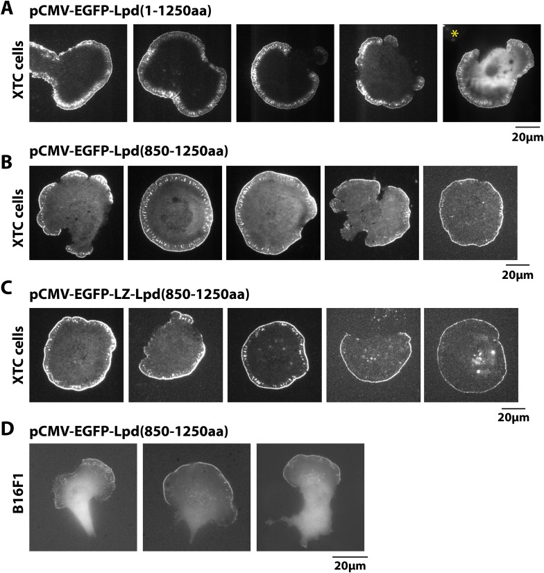 Figure 4—figure supplement 1. Localization of GFP-Lpd (850–1250aa) and GFP-LZ-Lpd (850–1250aa).(A, C) Representative images showing the plasma membrane localization of (A) GFP-Lpd1−1250aa, (B) GFP-Lpd850−1250aa, and (C) dimeric GFP-LZ-Lpd850−1250aa visualized with TIRF microscopy in XTC cells spread on PLL. Image in (A), marked with asterisk (*), is a representative cell imaged using with wide-field epifluorescence. Note the cytoplasmic localization of GFP-Lpd1−1250aa is not visible by TIRF microscopy. Scale bar, 20 µm. (D) Representative images of GFP-Lpd850−1250aa localization in polarized B16F1 cell migrating on laminin coated glass and imaged with wide-field epifluorescence. Scale bar, 20 µm.DOI: http://dx.doi.org/10.7554/eLife.06585.009 |