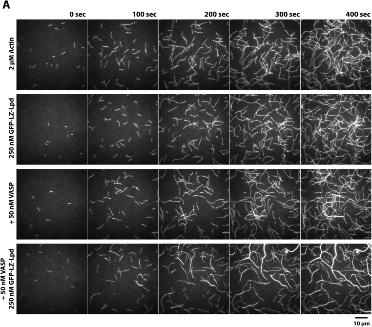 Figure 7—figure supplement 1. Lpd and VASP synergistically bundle actin filaments.(A) Montage of single actin filaments polymerizing in the presence of 2 µM actin (20% Cy5 labeled) and TIRF buffer containing 100 mM KCl. Compared to actin filaments elongating in the presence of 50 nM VASP (tetrameric concentration) or 250 nM GFP-LZ-Lpd850−1250aa (dimer concentration). The combined presence of VASP and GFP-LZ-Lpd850−1250aa produces large actin bundles. Scale bar, 10 µm.DOI: http://dx.doi.org/10.7554/eLife.06585.024 |