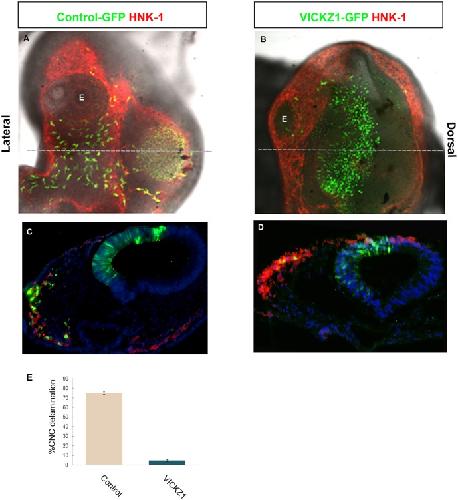 Fig 3. Overexpression of cVICKZ1 inhibits CNC emigration.2-4ss embryos were electroporated with either control GFP (A,C) or cVICKZ1-GFP (B,D), and fixed 20 hours post-electroporation. Embryos were stained for HNK-1 expression (red) and GFP (green) and photographed either as whole mount preparations (A,B) or after sectioning (C,D). The grey dotted line in (A) and (B) indicate the plane of section shown in (C) and (D), respectively. Almost no CNC delamination occurs in the cVICKZ1-GFP embryos, although GFP-negative, HNK-1-positive cells emigrate normally. (E) The percentage of the total number of GFP-positive cells that delaminated by 20 hours post-electroporation was calculated for each embryo and was graphed as the mean ± SEM (N = 5). Abbreviations: E, eye. |