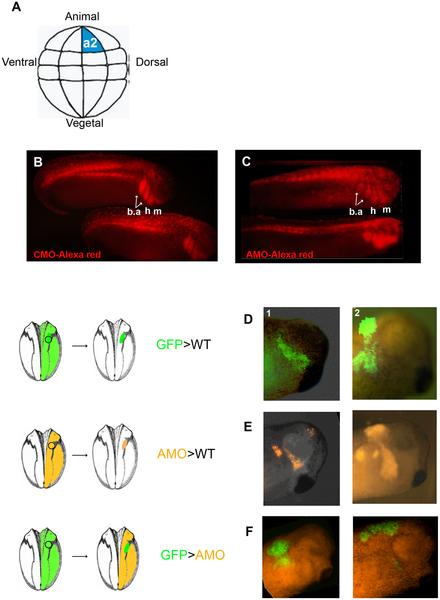 (A) A scheme illustrating the position of blastomere a2 in a 32-cell stage embryo that gives rise to most of the CNC cells in the embryo. (B,C) 32 cell-stage embryos were injected in a2 with Alexa-red and either control morpholino (CMO) (B) or xVICKZ antisense morpholino (AMO) (C) and allowed to develop to tailbud stage. Both AMO-and CMO-injected cells reach their homing sites in the branchial, hyoid, and mandibular arches (b.a., h, m). (D-F) CNC orthotopic transplantations. Wildâtype CNC grafts (in green) exhibited normal migration in control embryos (D), with grafts taken from a rostral position in the neural folds migrating along the mandibular migration pathway (D1) whereas grafts from more caudal position migrating to the branchial arches (D2). Grafts taken from xVICKZ-depleted embryos in orange, were able to migrate properly in WT embryos (E). However, wild-type CNC (green) were unable to migrate in xVICKZ AMO-injected embryos (orange). Abbreviations: m, mandibular; h, hyoid; b.a, branchial arches.