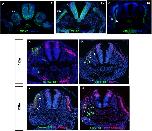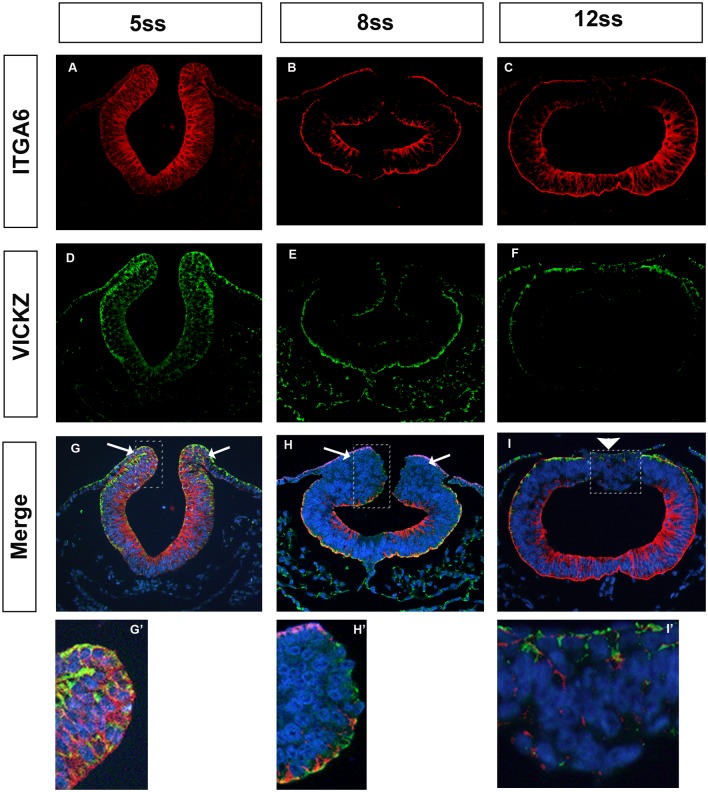 Fig 5. Integrin α6 and VICKZ expression during CNC delamination.Cross-sections at the midbrain level from chick embryos at 5ss (A,D,G), 8ss (B,E,H), and 12ss (C,F,I) were double stained with antibodies against Integrin α6 (A-C) and VICKZ (D-F). Merged images are shown in panels G-I. Higher magnification of the regions indicated by rectangles in G-I are shown in G’-I’. Integrin α6 is co-expressed with VICKZ in the neural folds in 5ss embryos (G, arrows, G’), undergoes down-regulation concomitantly with VICKZ as CNC delaminate (H, arrows, H’), and remains down-regulated, as does VICKZ, immediately following CNC emigration (I, arrowhead, I’). |