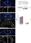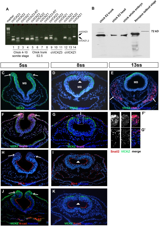 Fig 1. VICKZ expression during CNC delamination.(A) The three VICKZ paralogs were detected by RT-PCR in isolates from chick embryos at the 4â10 somite-stage (lanes 1â4) and at E2.5 (trunk region, lanes 5â9), using primer sets for cVICKZ3 (lanes 1,5), cVICKZ2 (lanes 2,6) and cVICKZ1 (lanes 3,7). All RT-PCR products were the appropriate size on ethidium bromide stained agarose-gel (cVICKZ3 = 426nt, cVICKZ2 = 206nt, cVICKZ1 = 172nt). Marker-1kb ladder. Negative controls: cVICKZ3-RT, PCR reaction using cVICKZ3 primers but without Reverse Transcriptase (lanes 4,8). Positive controls: cVICKZ3 (clone 5e15, Pubmed accession number AJ719686; lanes 9â11) and ZBP-1 for cVICKZ1 (lanes 12â14) using primer sets for cVICKZ3 (lanes 9,12), cVICKZ2 (lanes 10,13) and cVICKZ1 (lanes 11,14). (B) Proteins were extracted from tailbud stage Xenopus embryos, or from chick E2 stage whole embryos, head, or trunk. One embryo equivalent was loaded on each lane, and VICKZ expression was examined following electrophoresis by western blot analysis using an anti-pan VICKZ antibody. (C-K) Cross-sections at the midbrain (MB) level in chick embryos at 5ss (C,F,H,J), 8ss (D,G,I,K), and 13ss (E) were stained using antibodies directed against VICKZ (C-G, J-K), HNK-1 (E), Snail2 (F-G), ZO-1 (H-I), and N-cadherin (J-K). (Fâ) and (Gâ) are higher magnifications of the individual channels (red, green, and merge) of the boxed regions in (F) and (G). At early stages of CNC specification, presumptive CNC cells are located in the neural folds in the dorsolateral region (C, F, Fâ, H, J, arrows), where they express both VICKZ and Snail2 (F). ZO-1 and N-cadherin are expressed along the apical surface of the neuroepithelium at this stage, but are mostly excluded from the neural folds (H,J). Down-regulation of VICKZ occurs in 8ss embryos in the dorsal-most, delaminating CNC cells that remain Snail2-positive (G, arrow, Gâ) and are negative for ZO-1 and N-cadherin (I,K arrowhead). HNK-1-positive migrating CNC do not express VICKZ (E, arrows). Abbreviations: MB, midbrain. All sections were also stained with Hoechst to show nuclei (blue). |