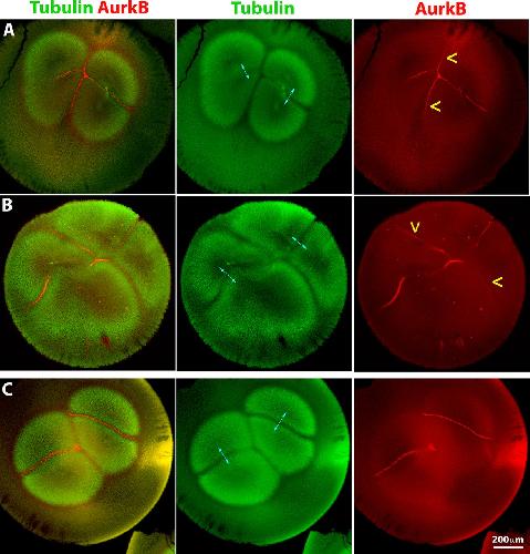FIGURE 4:. Forced activation can recruit the CPC to interaction zones between nonsister asters. An activating anti-INCENP IgG was injected into polyspermic eggs 60–70 min postfertilization (after first mitosis). Sister asters in A–C are indicated by cyan double-headed arrows. (A) Bispermic egg fixed 90 min postfertilization. Note recruitment of CPC at similar levels to the interaction zones between sister and nonsister asters (CPC recruitment between nonsisters is highlighted by yellow arrowheads). Note that the aster morphology has been slightly distorted by the injection. (B) Bispermic egg fixed 98 min postfertilization. Same labeling convention as in A. CPC is recruited to interaction zones between nonsister asters. (C) Uninjected bispermic egg fixed at the same stage as A for comparison. CPC is not recruited between nonsister asters. |