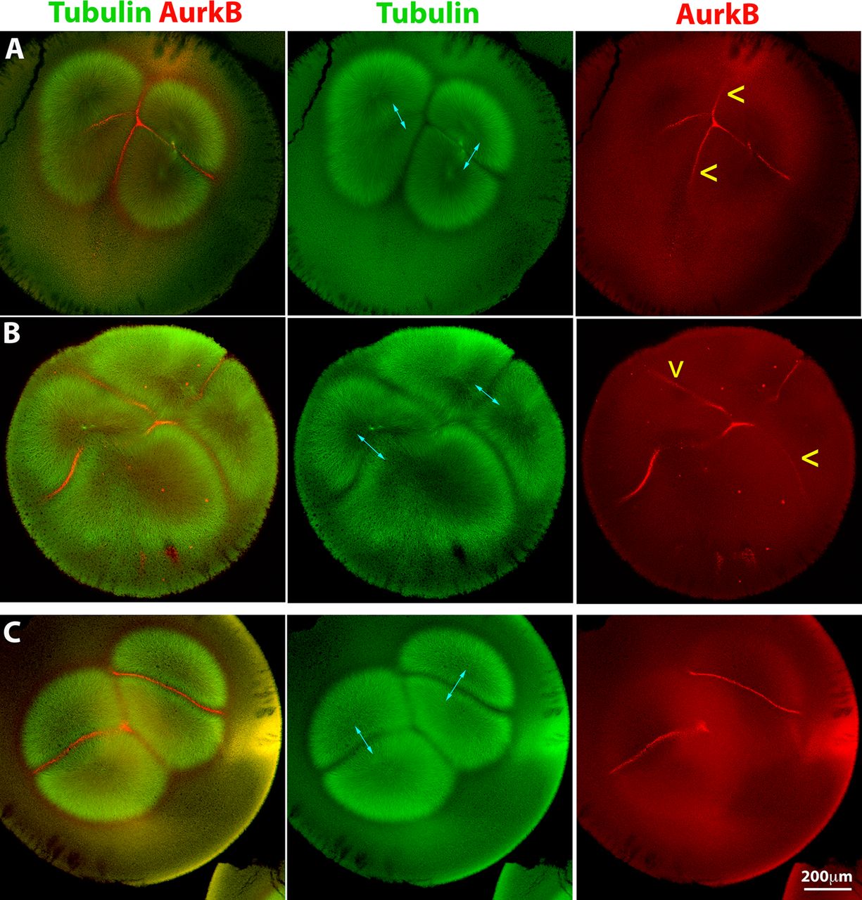 FIGURE 4: Forced activation can recruit the CPC to interaction zones between nonsister asters. An activating anti-INCENP IgG was injected into polyspermic eggs 60–70 min postfertilization (after first mitosis). Sister asters in A–C are indicated by cyan double-headed arrows. (A) Bispermic egg fixed 90 min postfertilization. Note recruitment of CPC at similar levels to the interaction zones between sister and nonsister asters (CPC recruitment between nonsisters is highlighted by yellow arrowheads). Note that the aster morphology has been slightly distorted by the injection. (B) Bispermic egg fixed 98 min postfertilization. Same labeling convention as in A. CPC is recruited to interaction zones between nonsister asters. (C) Uninjected bispermic egg fixed at the same stage as A for comparison. CPC is not recruited between nonsister asters. |